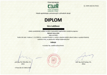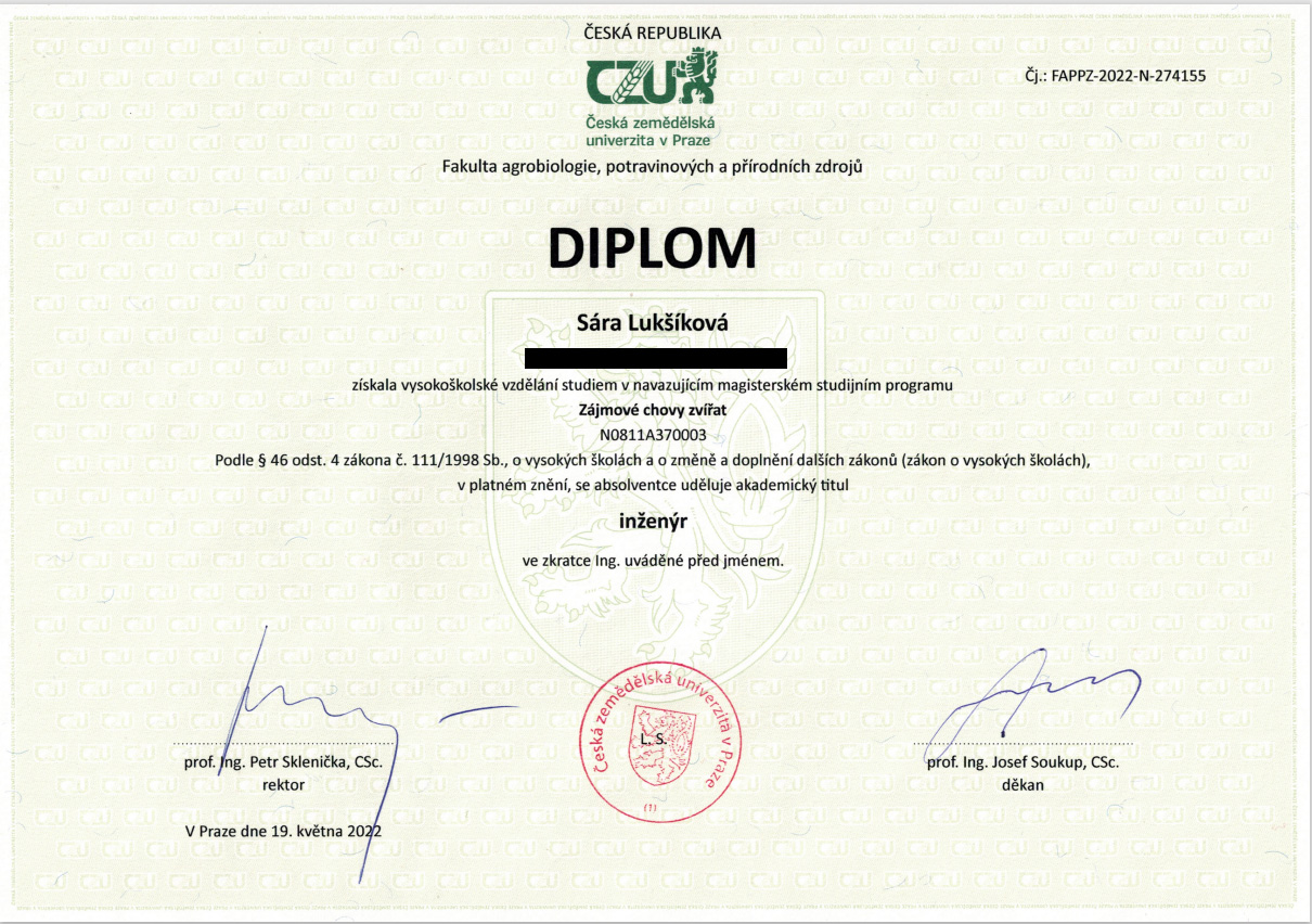 Po gymnáziu jsem vystudovala Českou zemědělskou univerzitu v Praze, obor Zájmové chovy zvířat, kde jsem získala titul inženýr. Na univerzitě jsem zůstala i nadále, aktuálně tam dělám doktorát z parazitologie, zaměřený především na parazitické prvoky.