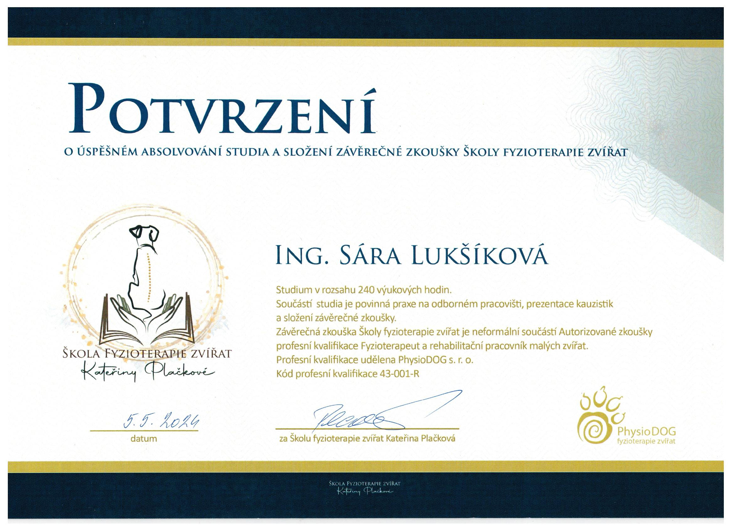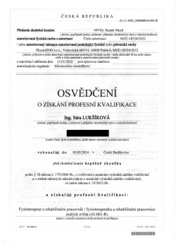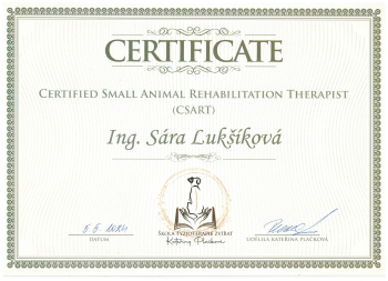 Paralelně jsem absolvovala Školu fyzioterapie zvířat Kateřiny Plačkové s titulem CSART (Certified Small Animal Rehabilitation Therapist), která mi umožnila propojit vědecké znalosti s praxí. Tahle kombinace mi dává obrovský smysl – teorie vysvětluje, proč tělo reaguje, jak reaguje a fyzioterapie ukazuje, co se s tím v reálu dá dělat.